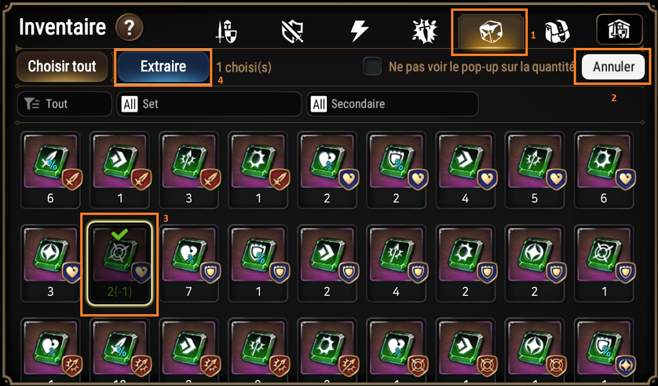Pour cela il faudra se rendre dans le 5ème onglet de l'inventaire (1) et dans ingrédient de permutation. Il faudra alors réorganiser (2) puis sélectionner les pierres que l'on souhaite extraire (3) et enfin valider pour obtenir les noyaux de permutation qui vous serviront dans le clocher de l'alchimiste.