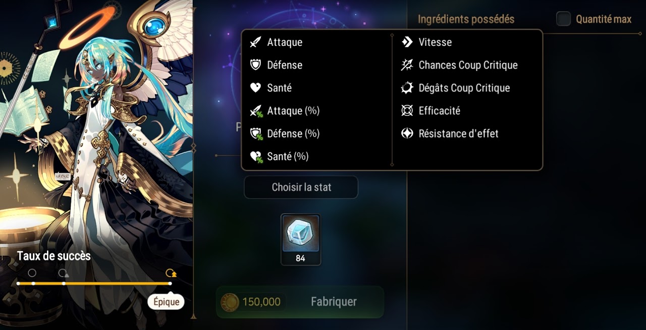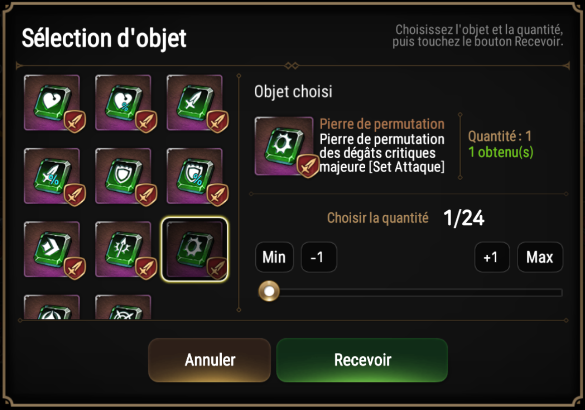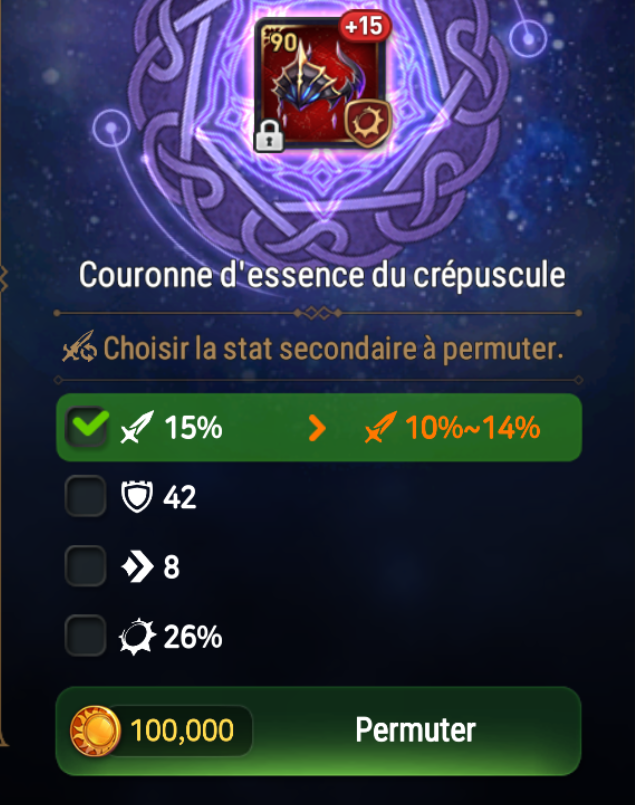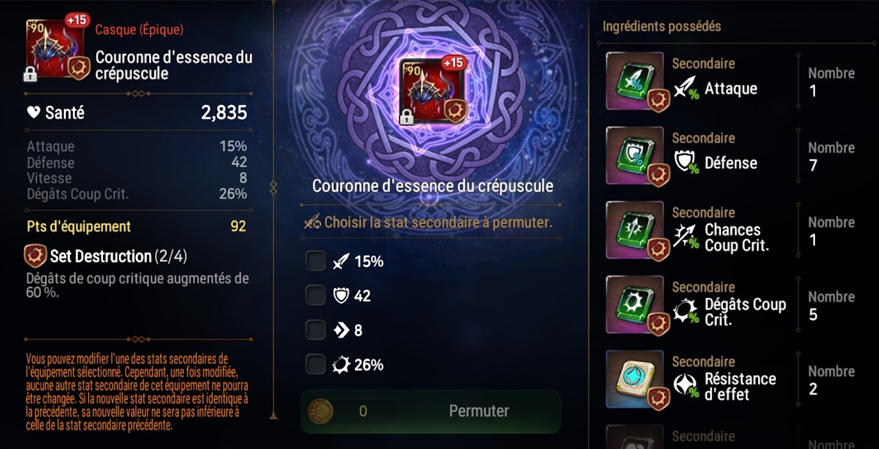 NOTE : les permutations obéissent aux lois classiques des équipements. Il est impossible d'obtenir un doublon de caractéristique entre les caractéristiques secondaires et principales.
