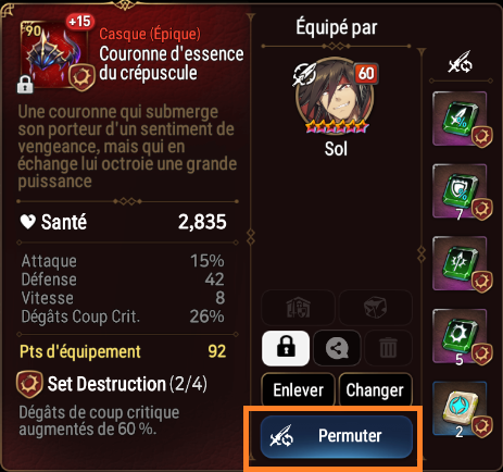 Rendez-vous sur l'équipement que vous souhaitez modifier. Puis cliquez sur permuter pour améliorer votre équipement.