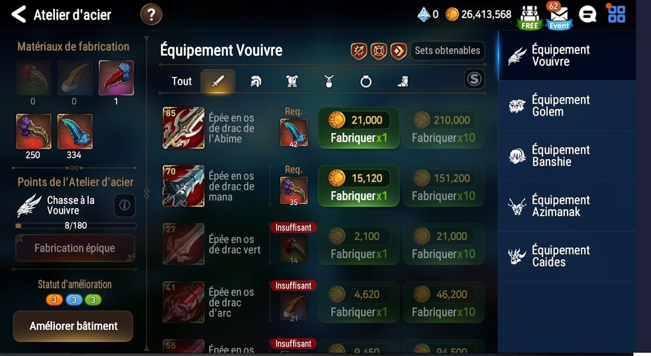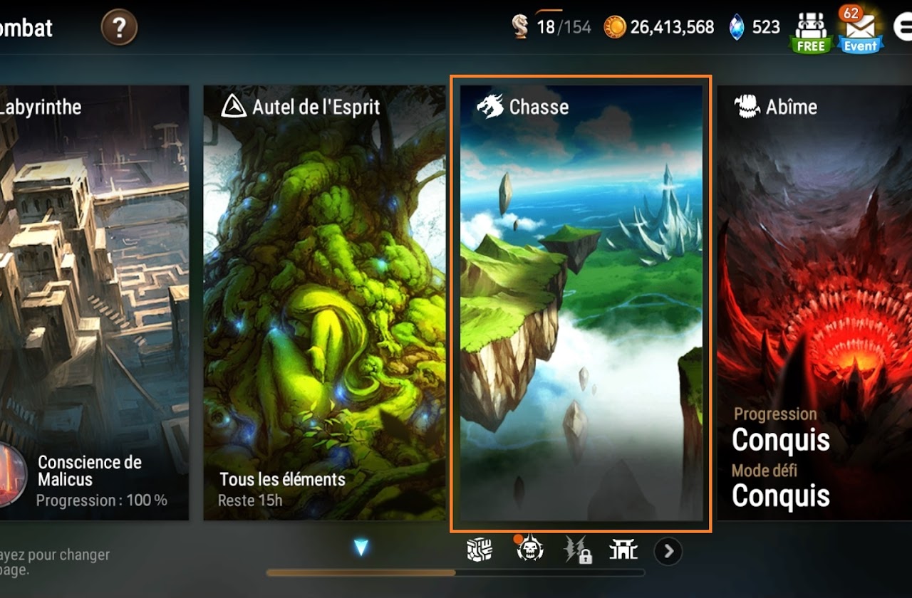 Les chasses sont un contenu permettant de récupérer des équipements à deux échelles. En sortant vainqueur d'une chasse, vous allez récupérer des équipements ainsi que des matériaux de fabrication. Les matériaux de fabrication vous permettront de fabriquer des équipements dans l'atelier d'acier qui se trouve en bas à droite de l'onglet sanctuaire dans le menu d'accueil d'Epic Seven.