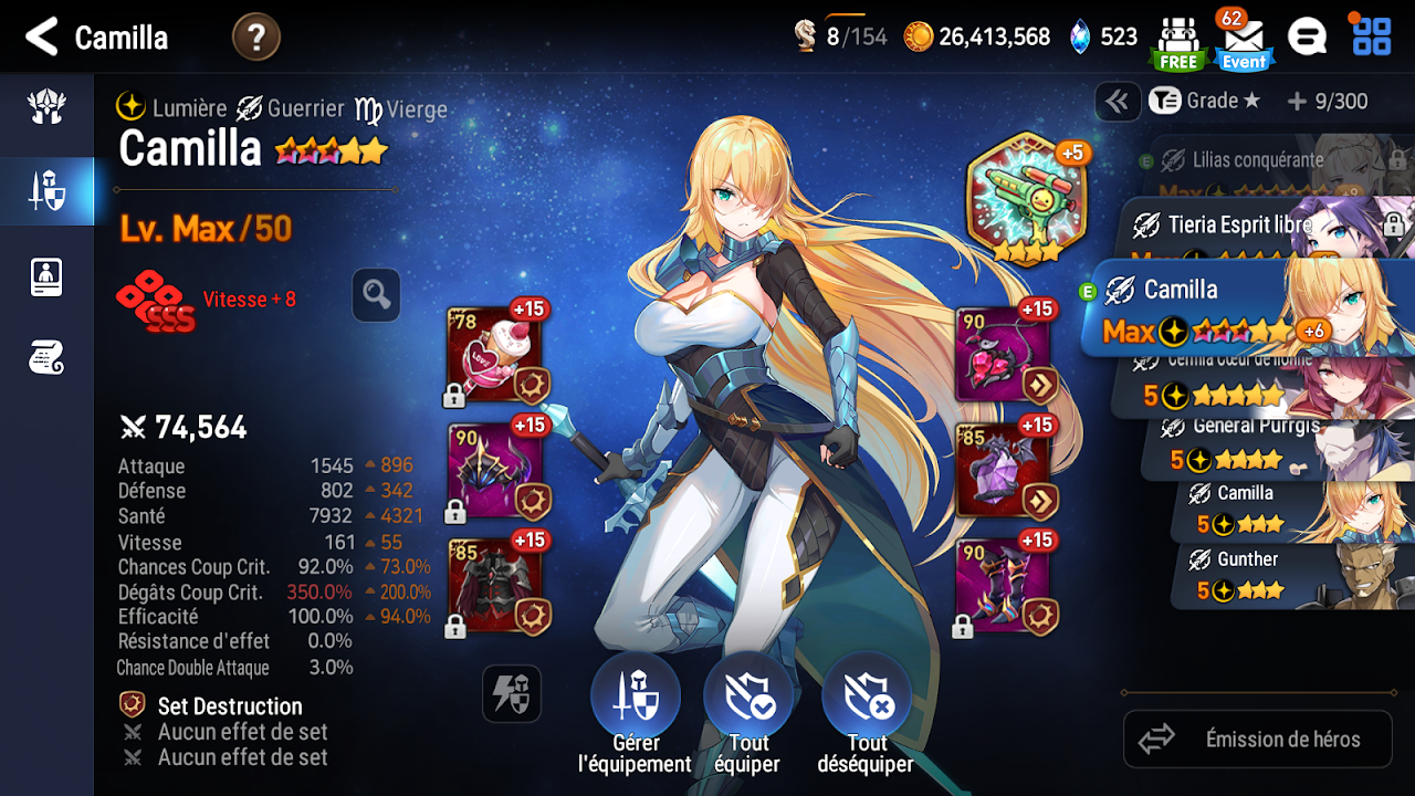 Angélica Pécheresse : max 180 speed, 200 ER, artefact qui boost la team
