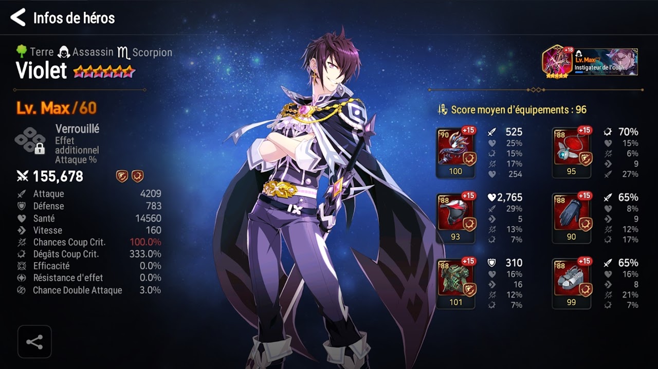Violet avec le plus de dégâts possible en destruction et infiltration. Il faut plus de 14 500 hp, un peu de vitesse et surtout un artefact évasion.