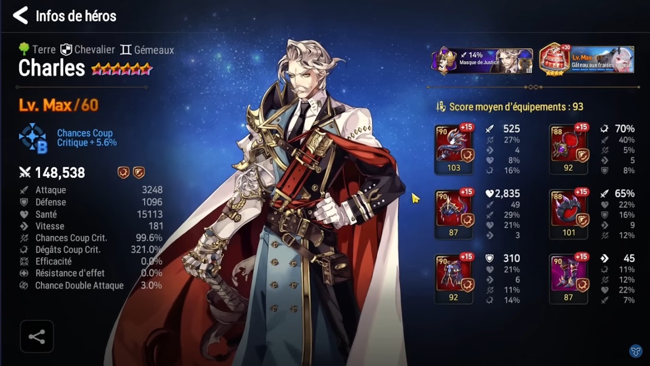 Charles avec le plus de dégâts possible en destruction et infiltration. Il faut plus de 14 500 hp, un peu de vitesse, son troisième EE et un artefact dégâts.