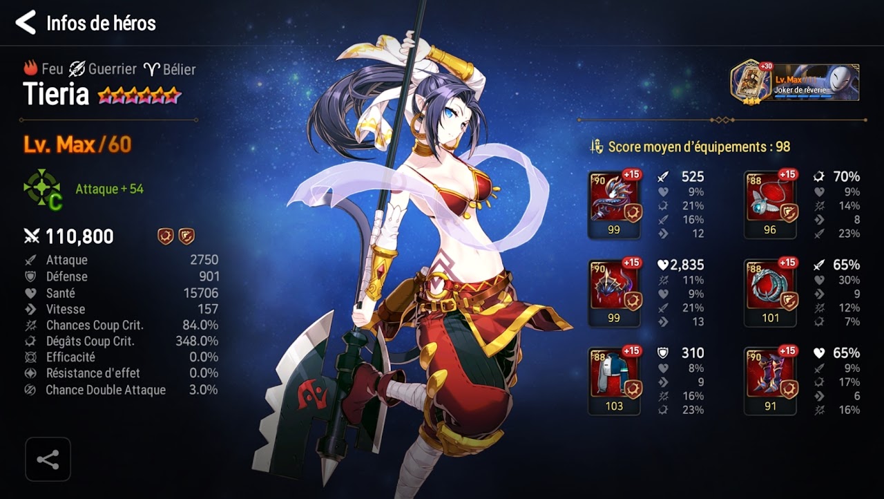 Tiera avec le plus de dégâts possible en set destru et infiltration. il faut qu'elle ait un peu de vitesse et au moins 14 500 HP. Joker de réverie est requis.