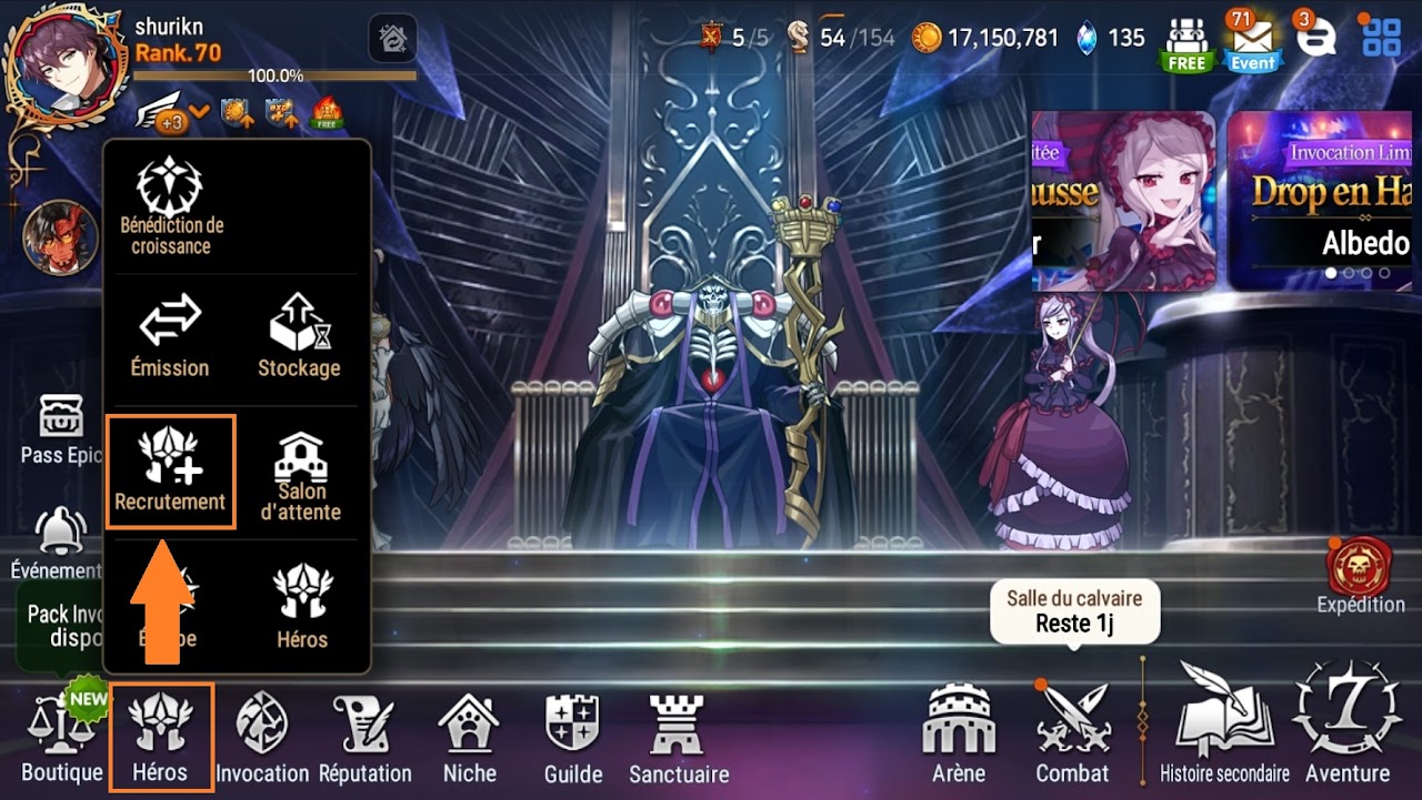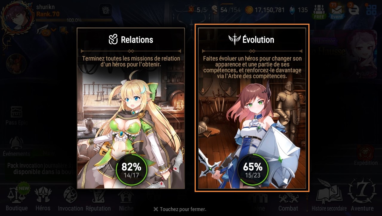 Pour accéder aux évolutions, il faudra se rendre dans l'onglet Héros > Recrutement