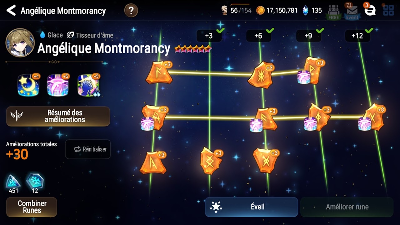 Pour améliorer un héros évolué, il faudra améliorer son arbre de compétence avec les 3 différents types de runes selon son éléments : 415 runes majeures et 40 runes épiques seront nécessaires.